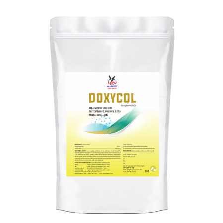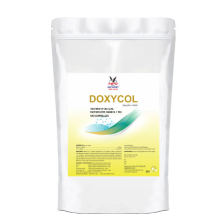 DOXYCOL is a synergistic combination of two antibiotics which is indicated for prevention and treatment of diseases caused by Gram-positive and Gram-negative bacteria such as E.coli, salmonella, fowl cholera, infectious coryza, chronic respiratory disease(CRD), campylobacter and non-specific enteritis. It is indicated for treatment and prevention of gastrointestinal infections, respiratory infections, urogenital infections, local inflammations and secondary bacterial infections during viral diseases in calves, lambs, poultry, pigs and pigeons.