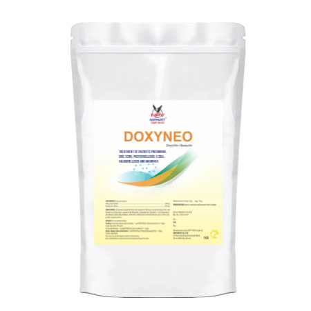 Indicated to Gastrointestinal and respiratory infections caused by Doxycycline and Neomycin sensitive micro-organisms like Bordetella, Campylobacter, Chlamydia, E. coli, Haemophilus, Mycoplasma, Pasteurella, Rickettsia, Salmonella, Staphylococcus and Streptococcus spp. in calves, kids, poultry, lambs and swine