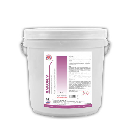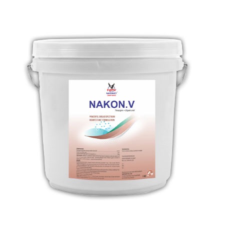 INDICATIONS: NAKON.V is a powdered stabilised blend of peroxygen compounds, surfactant, organic acid and an inorganic buffer system for broad‐spectrum pathogen control, effective against all classes of viruses, gram‐positive and gram‐negative bacteria and fungi.