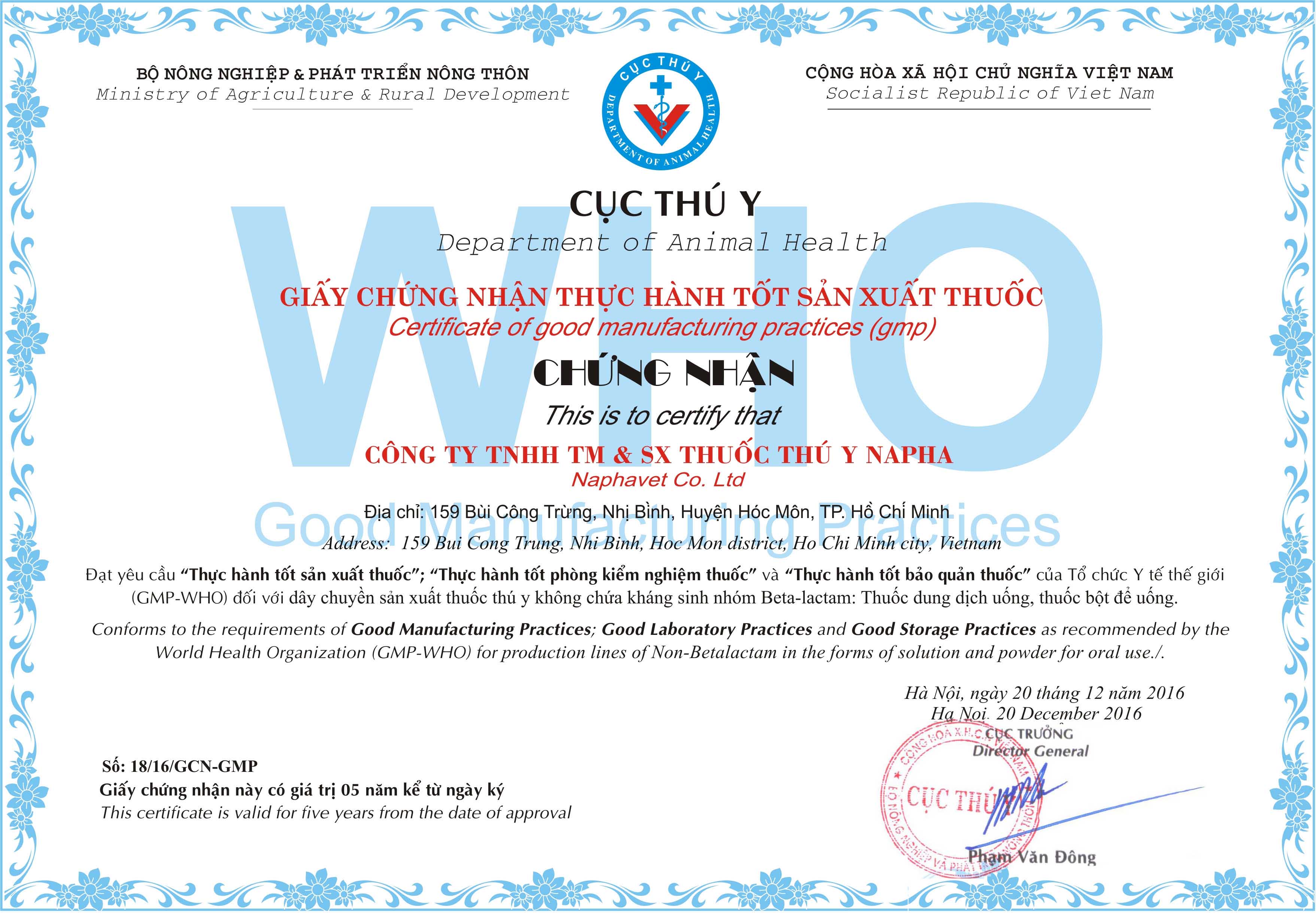 NAPHAVET CO., LTD specializes in the manufacturing of veterinary medicines and other animal healthcare products for cattle, poultry, and aquaculture according to international standards. NAPHAVET gradually asserts the value of its brand and builds trust through customer evaluations and support from reputable organizations. A major milestone in the company's history was the GMP – WHO certification for its non-beta-lactam solution and powder production lines in 2012, marking a successful 10-year journey.