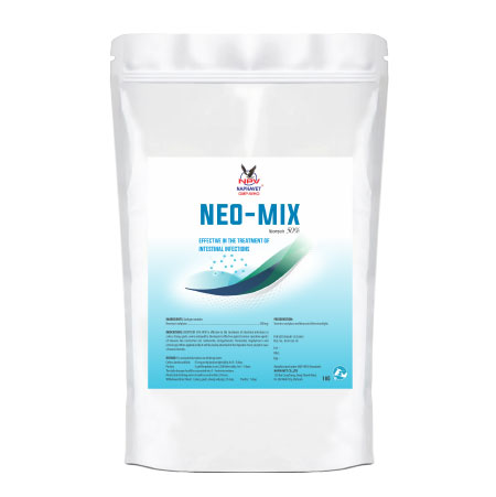 NEO - MIX is effective in the treatment of intestinal infections in calves, sheep, goats, swine and poultry. Neomycin is effective against various causative agents of diseases like Escherichia coli, Salmonella, Campylobacter, Pasteurella, Staphylococci and Listeria spp. When applied orally it will be poorly absorbed in the digestive tract, except in case of severe enteritis.