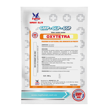 Treatment of gastrointestinal & respiratory infections caused by oxytetracycline sensitive bacteria like Bordetella spp., Bacillus spp., Corynebacterium spp., Campylobacter spp., E. coli, Haemophilus spp., Pasteurella spp., Salmonella spp., Staphylococcus spp., Streptococcus spp.,Mycoplasma spp., Rickettsia spp., Chlamydia spp.