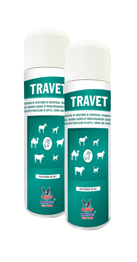 TRAVET SPRAY is indicated for cutaneous administration. Shake the container thoroughly before spraying. The container should be held at a distance of 15 - 20 cm from the area to be sprayed; spray for approximately 3 seconds (equivalent to approximately 3.9 g of product or 0.10 g chlortetracycline) until the treatment-area is evenly coloured. In case of claw/ hoof infections this treatment should be repeated after 30 seconds.